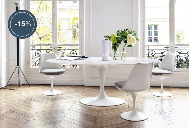 Ontvang 15% korting op de legendarische Saarinen tafels met zwart of wit laminaat tafelblad