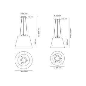 | Afmeting | Hoogte: H 29cm / Ø 42cm: 29cm H 36cm / Ø 52cm: 36cm Doorsnee: H 29cm / Ø 42cm: 42cm H 36cm / Ø 52cm: 52cm Lengte ophangpunt: 200cm Doorsnee baldakijn: 18cm Doorsnee lampenkap: H 29cm / Ø 42cm: 42cm H 36cm / Ø 52cm: 52cm |