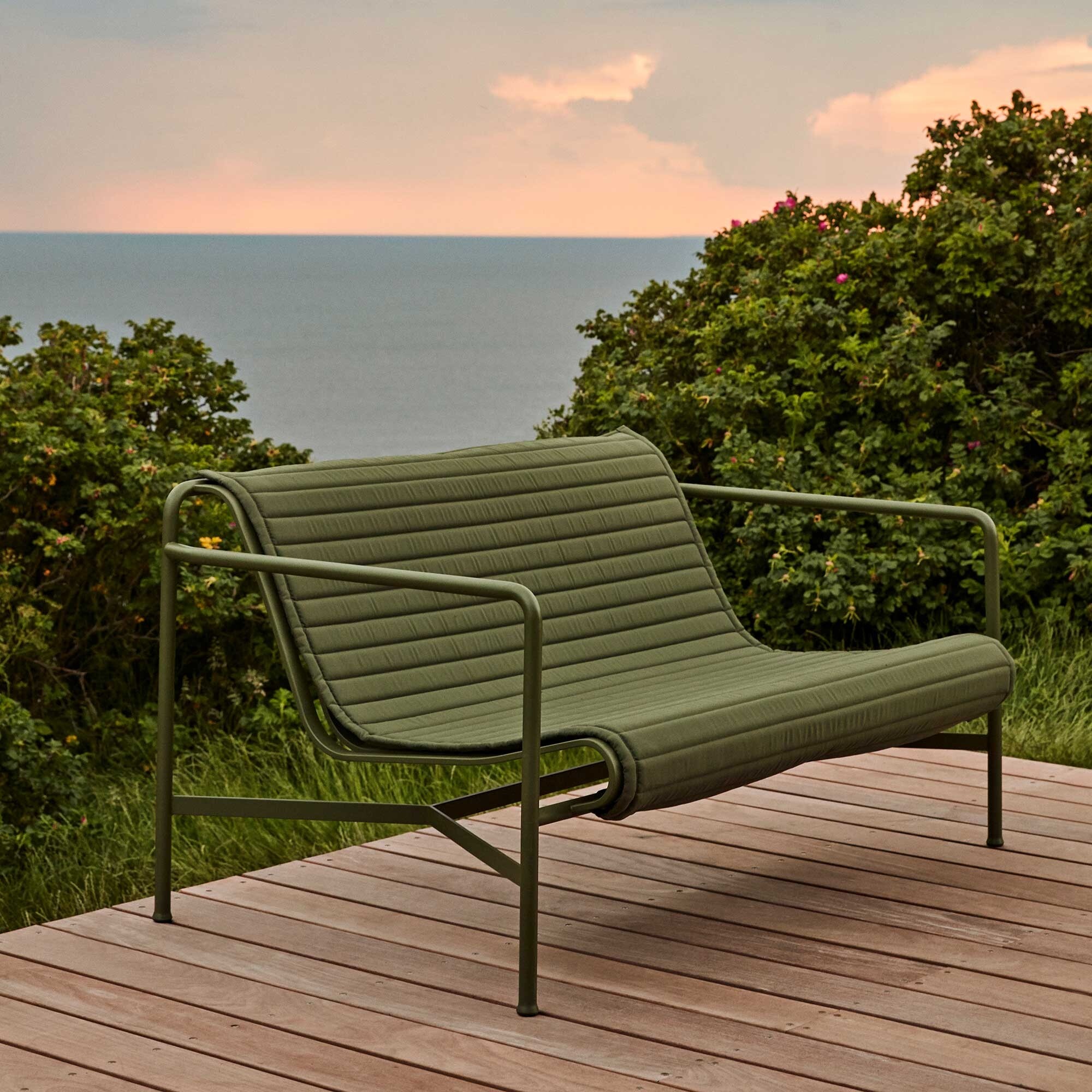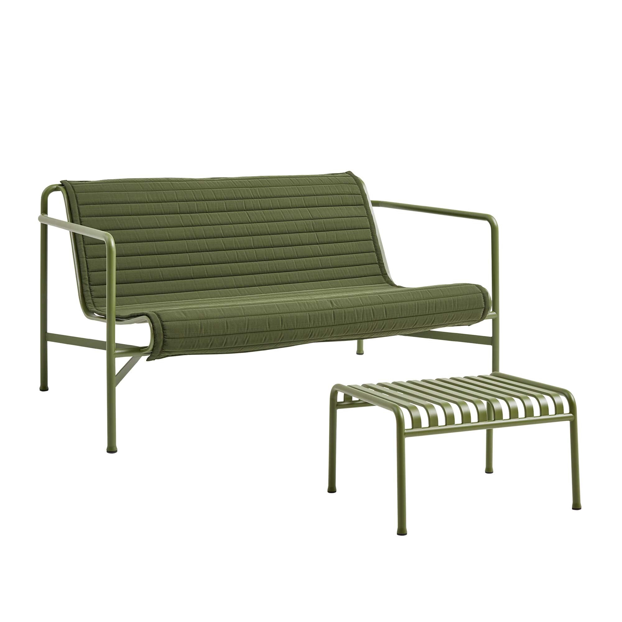 Palissade tuinset sofa met gewatteerd kussen + ottomaan Dit product is door Ronan & Erwan Bouroullec voor het merk HAY ontworpen.