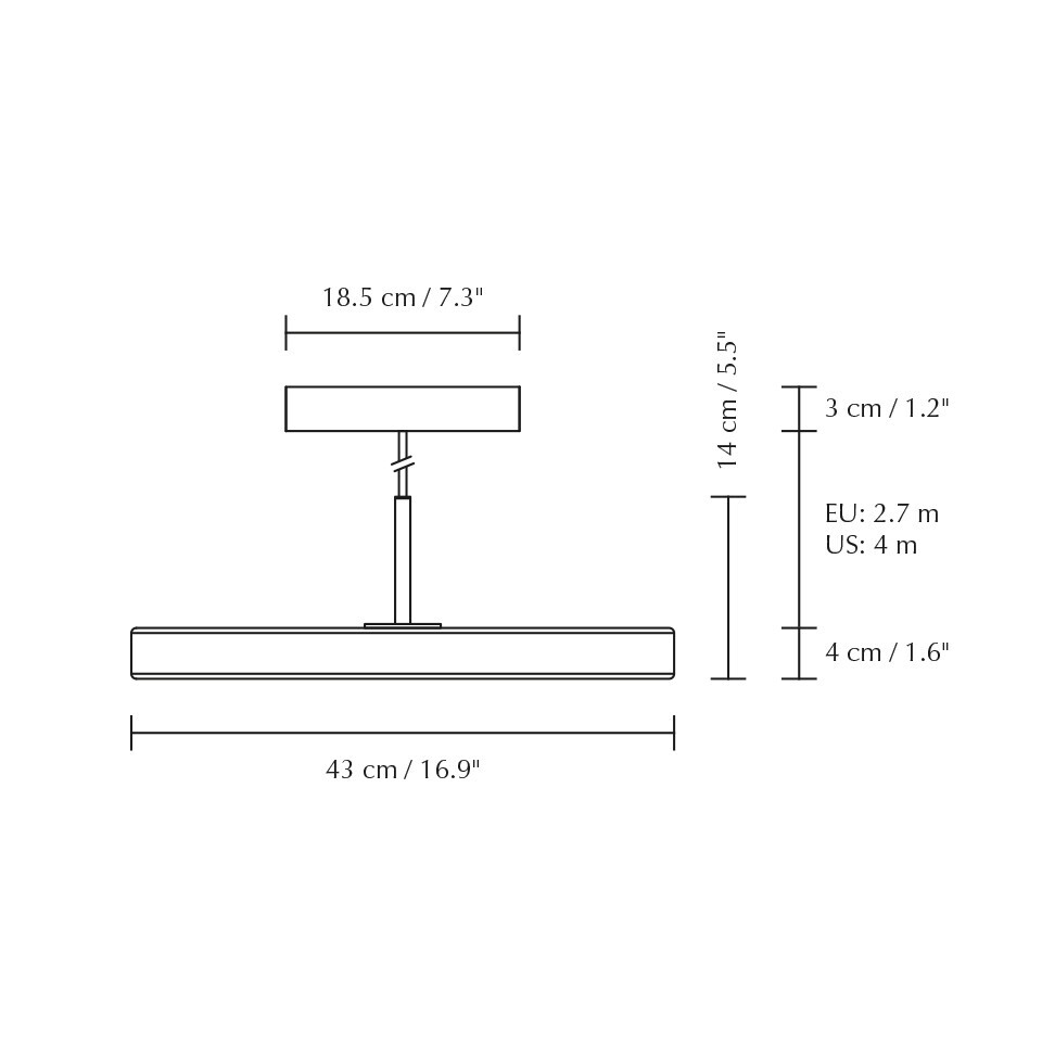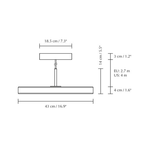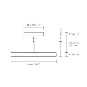 | Afmeting | Hoogte: 14cm Doorsnee: 43cm Kabellengte: 270cm Doorsnee baldakijn: 12cm Doorsnee lampenkap: 43cm |